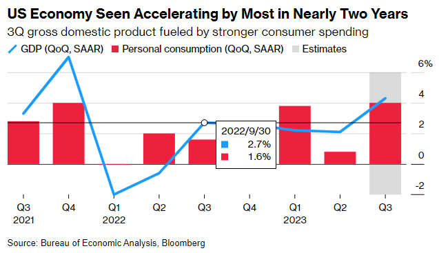 在美国消费者坚定的支持下,全球最大经济体第三季度可能以近两年来最快的速度扩张,这对正在讨论是否需要进一步收紧政策的美联储官员来说是一个挑战。