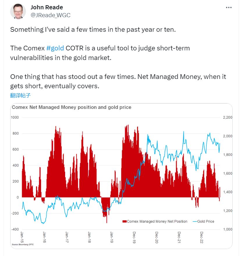 "我在过去的一年或十年里已经说过好几次。 Comex黄金《承诺者分析报告》是一个有用的工具,用来评估黄金市场的短期脆弱性,"世界黄金协会首席市场策略师约翰·里德(John Reade)在社交媒体上说。 "有一件事在好几次中显现出来。在投资者净多头时,最终会减仓。这可能需要几周,甚至几个月,但当它发生时,黄金的价格将大幅上涨。"