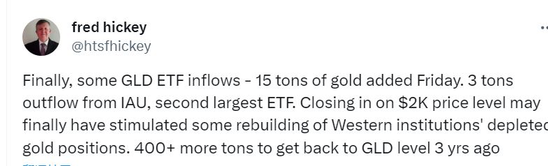 数据显示,除了投机动力增加外,长期投资者也开始进入市场,并购买支持黄金的交易所交易产品。全球最大的黄金ETF SPDR黄金股票(NYSE: GLD)在黄金价格大部分时间保持在2000美元/盎司以上的情况下,上周五增持了15吨。