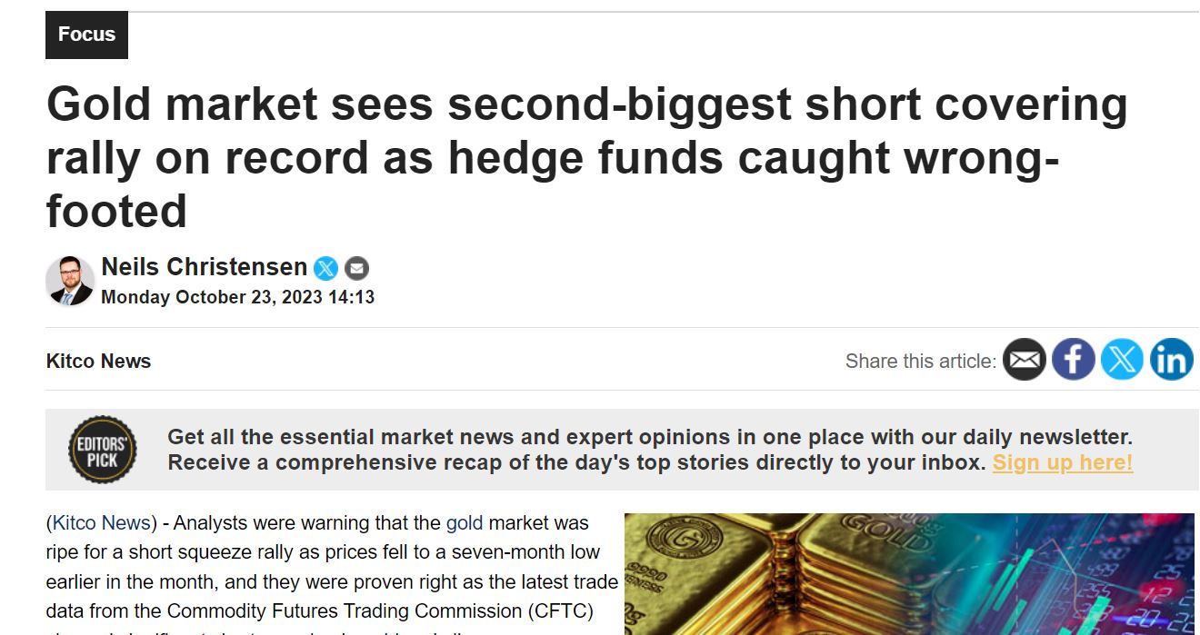 Kitco News尼尔斯·克里斯滕森 (Neils Christensen)发表文章:”由于对冲基金措手不及,黄金市场出现有记录以来第二大空头回补涨幅“。