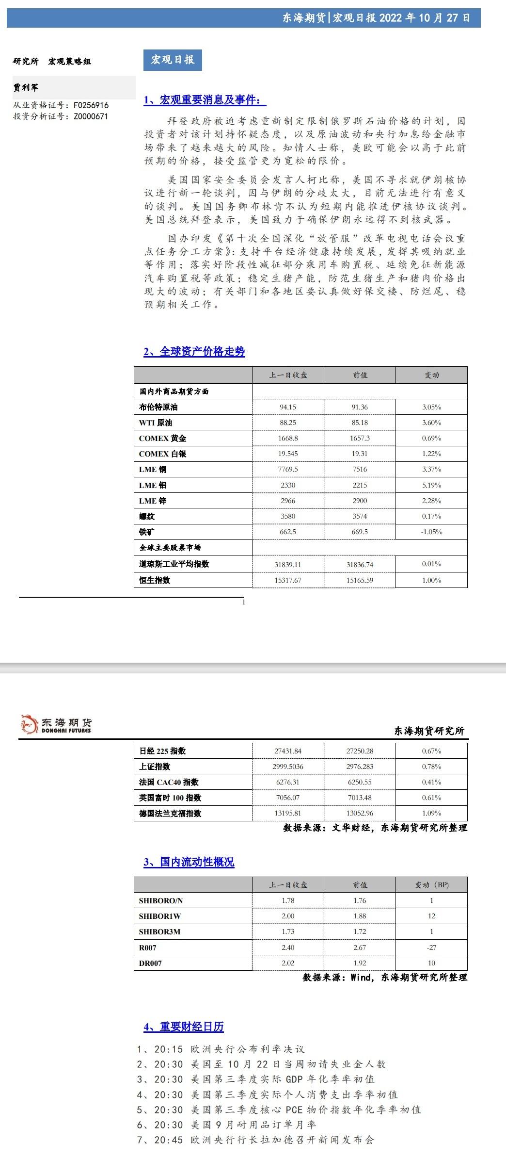 【东海期货10月27日宏观日报】:市场预期经济放缓将令美联储放松货币紧缩政策,美元大跌