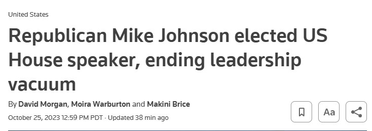 周三(10月25日),美国众议院选举几乎没有领导经验的保守派共和党人约翰逊为议长,结束了三周以来的动荡局面。三周以来,没有掌舵的众议院无法履行任何基本职责。