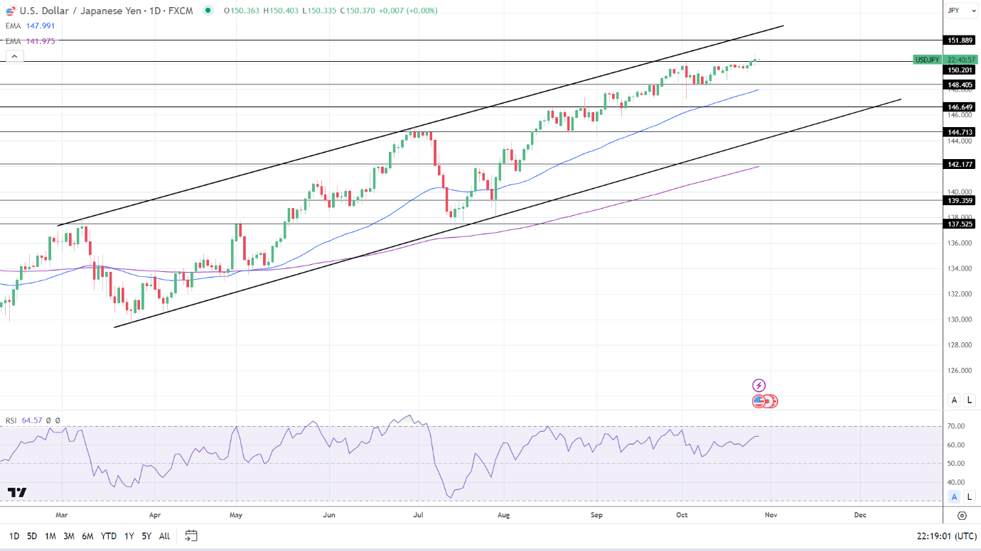 14天RSI为64.57,表明美元/日元在进入超买区域之前将回到151。