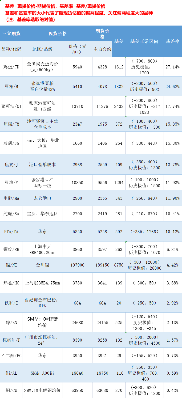 三立期货10月27日基差:一张图尽览有色金属、黑色系、能源化工和农产品基差(按基差率从大到小排序)