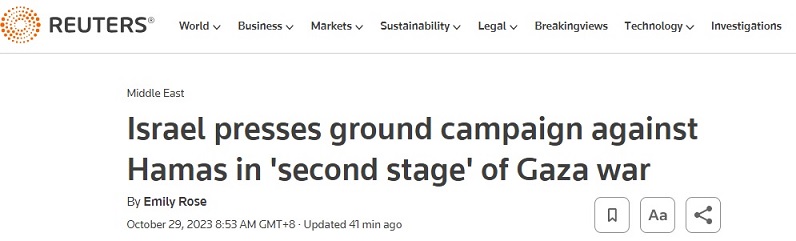 英国金融时报在报道中指出,以色列此次宣布的战争新阶段不知是以色列一直威胁要进行的对加沙发动全面地面进攻的开始,还是更多规模有限的频繁地面攻击的一部分。