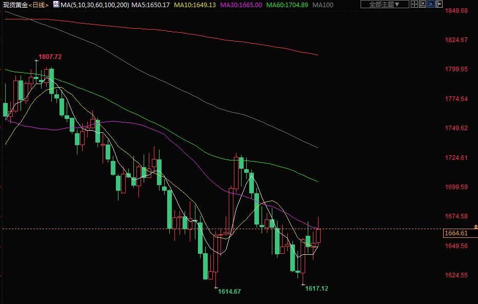 金价周三升至两周高位,因市场预期美联储将从12月开始收敛其激进的加息立场,拖累美元和美债收益率下滑。现货金上涨0.8%,至每盎司1665.09美元,盘中触及10月13日以来最高。