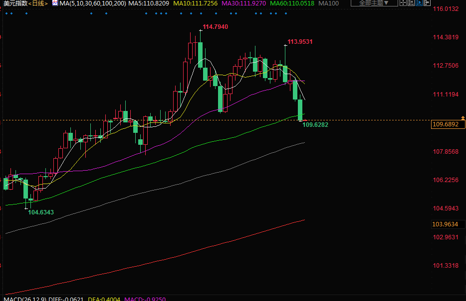 美元指数交投于109.68附近;美元兑一篮子货币周三下跌超1%,为9月20日以来最低,经济数据疲软坚定了美联储将放缓加息步伐的看法,推动