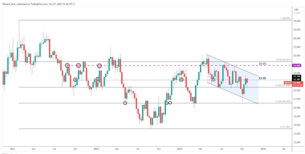 Richard Snow表示,白银在尝试测试2021年到2022年主要跌幅的50%斐波那契回撤位23.83美元后,白银在大约一周前见顶。