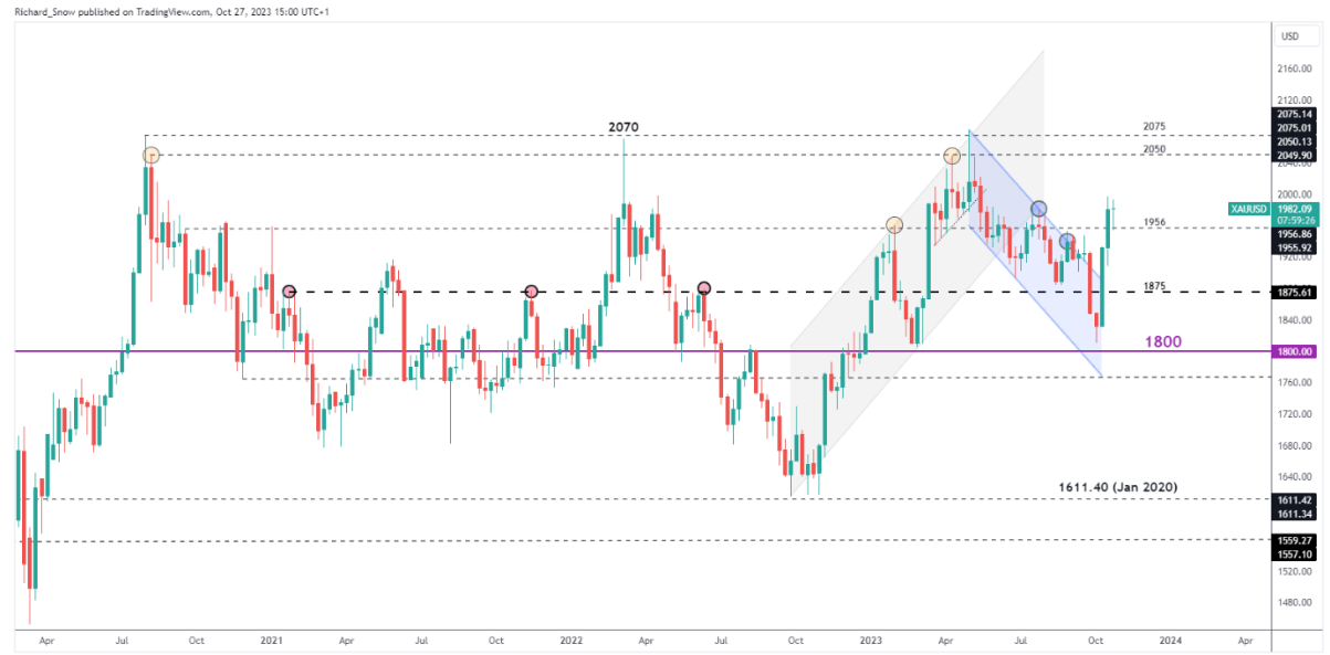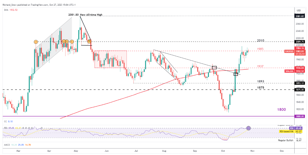 “2010美元似乎是下一个阻力位,随后是2081.80美元左右的历史高点,金价目前远高于200日简单移动平均线 (SMA)。如果价格走势从此处回调,支撑位将出现在1937美元,该位置与200日SMA重合。”