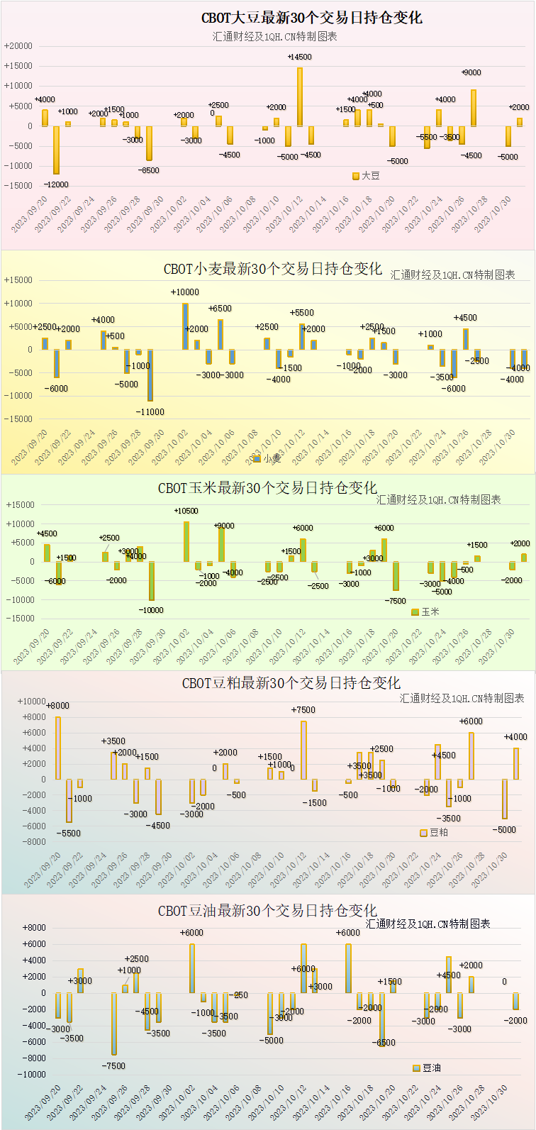 交易商估算的结果显示,大宗商品基金本周二(10月31日)增加大豆、玉米、豆粕投机性净多头头寸,增加小麦、豆油投机性净空头头寸。10月整月,大宗商品基金增加玉米、豆油投机性净空头头寸,增加大豆、小麦、豆粕净多头头寸。