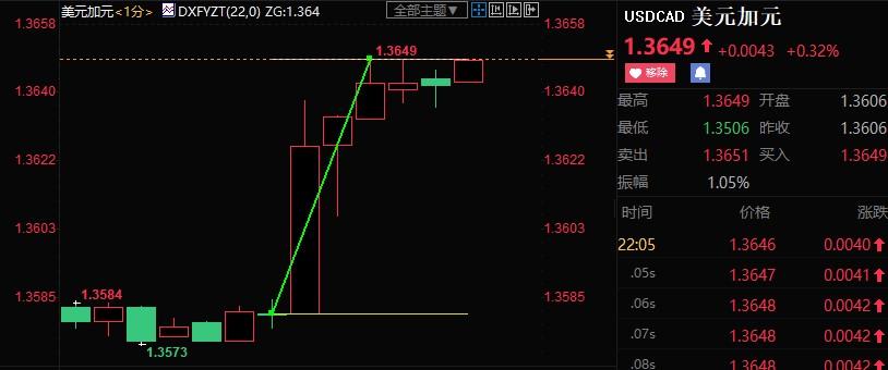 美元兑加元跳涨近70点至1.3650。