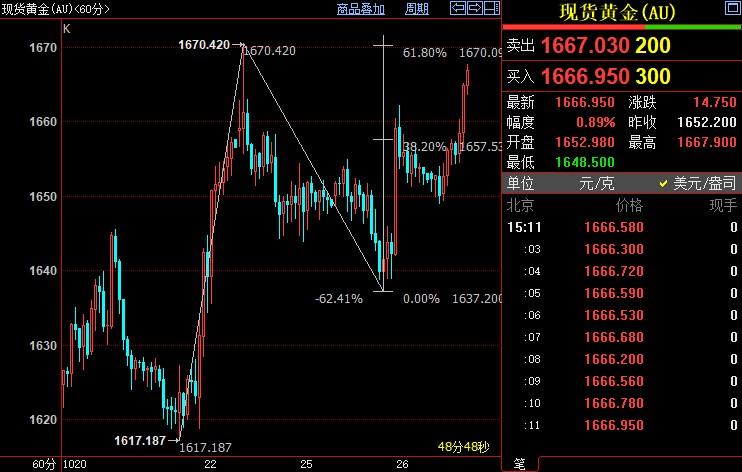 现货黄金上涨1.07%至1670.76美元/盎司;COMEX期金主力合约上涨1.28%至1675.2美元/盎司;
