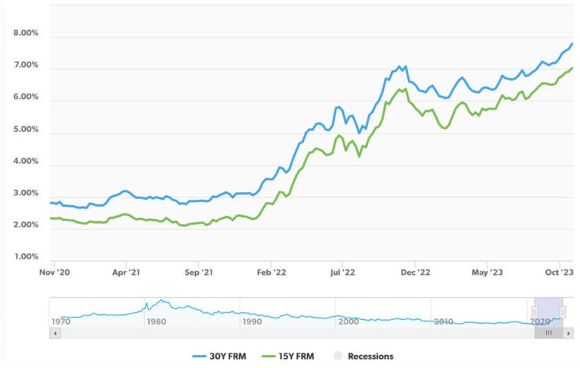 抵押贷款利率受美国国债收益率的影响,而国债收益率受美联储货币政策的影响。随着市场在10月份调整美联储对长期加息的预期,基准债券收益率飙升,帮助将30年期抵押贷款推高至目前徘徊在8%的令人瞠目结舌的水平。根据Bankrate的数据,周四30年期固定抵押贷款的平均利率为8.02%。