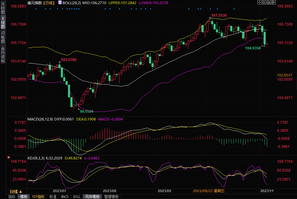 美元指数自周初震荡反弹一度突破107关口,最高触及107.11,随着美联储鸽派暂停,暗示可能结束激进的紧缩周期,美指周三自高位急剧回落,随后接连失守106以及105关口,周五更是在爆冷非农的影响下暴跌超100点,最低触及104.94水平,为9月20日以来新低,当周勉强收于105关口上方,周跌幅超过150点,或1.42%,为7月中旬以来最大周跌幅。