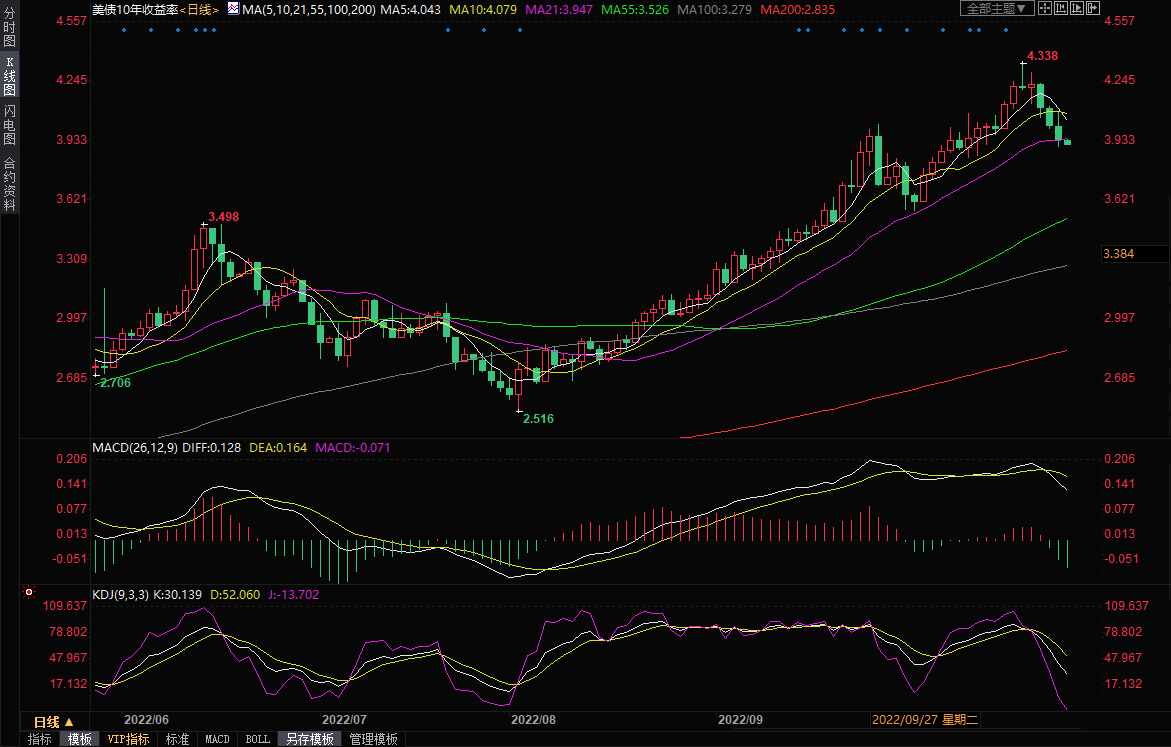 【美债收益率跌至近两周低位,支出放缓推动美联储软化立场的希望增强】美国国债收益率周四进一步下跌,10年期美债收益率盘尾下跌5.5个基点,至3.960%,30年期美债收益率下跌6个基点,至4.104%,此前数据显示美国消费者和企业支出在第三季有所放缓,这表明通胀可能触顶,或将推动美联储软化激进加息的立场。