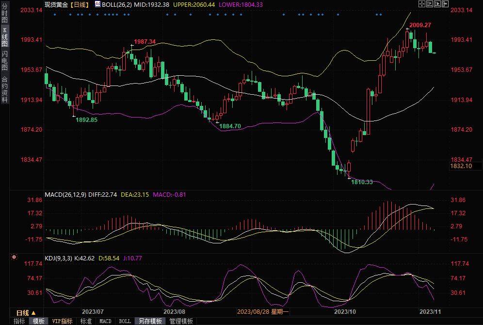 现货黄金周一收跌0.73%,收报1977.78美元/盎司。