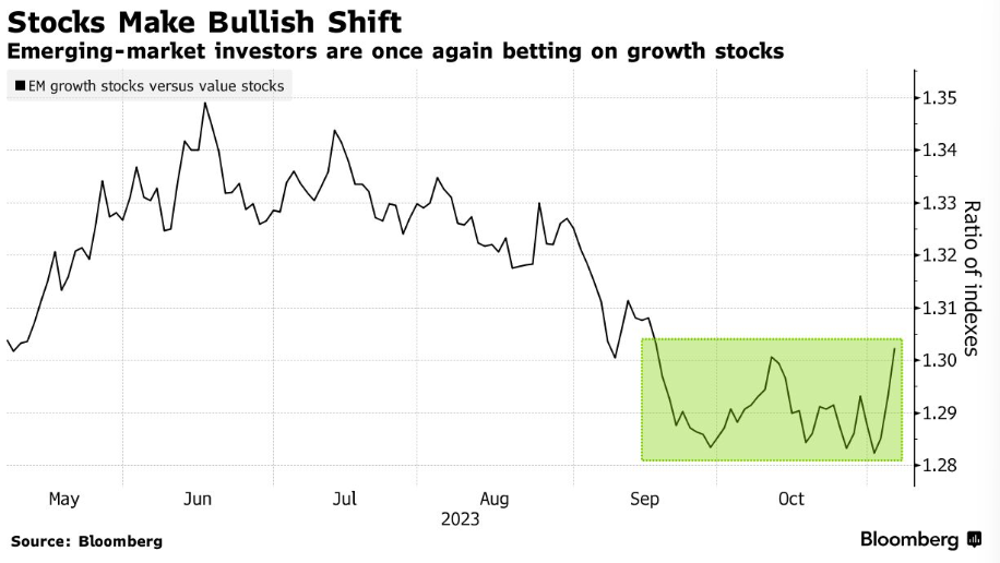 过去两周,由于对全球利率的担忧减轻,投资者开始对美联储已经结束加息周期的乐观情绪,这使得发展中国家的股市总市值增加了1.1万亿美元。与此同时,成长型股票在过去三天内表现出色,相对于更为稳定的价值型股票,它们的涨幅创下了自3月以来的最大增幅。