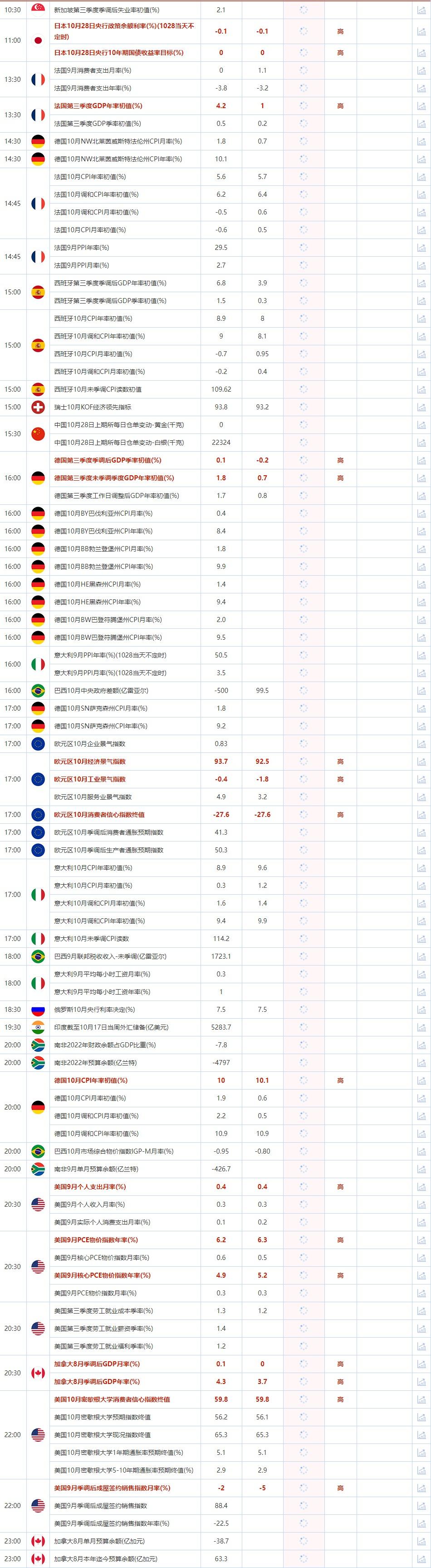 11:00 日本10月28日央行10年期国债收益率目标(%) , 前值 0 , 预期值 0 , 公布值:待发布13:30 法国9月消费者支出月率(%) , 前值 0 , 预期值 1.1 , 公布值:待发布
