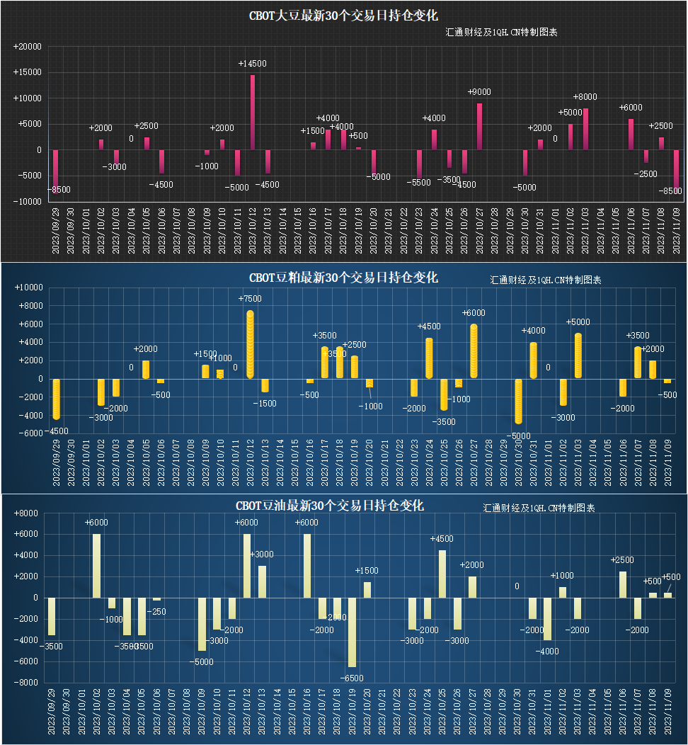 交易商估算的结果显示,大宗商品基金本周四(11月9日)增加豆油投机性净多头头寸,增加玉米、大豆、小麦、豆粕投机性净空头头寸。最近30个交易日,大宗商品基金本增加玉米、豆油、小麦投机性净空头头寸,增加豆粕、大豆投机性净多头头寸。