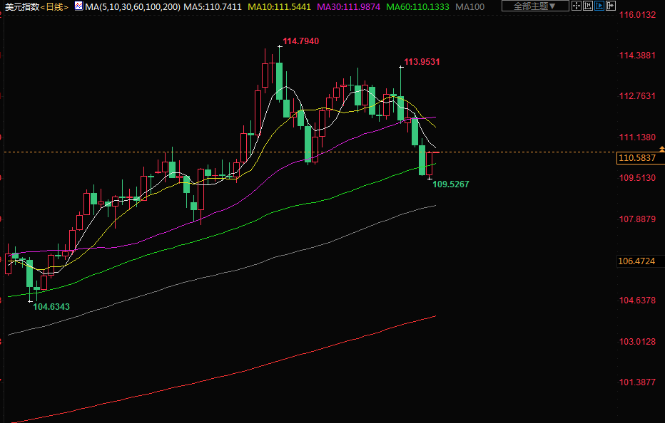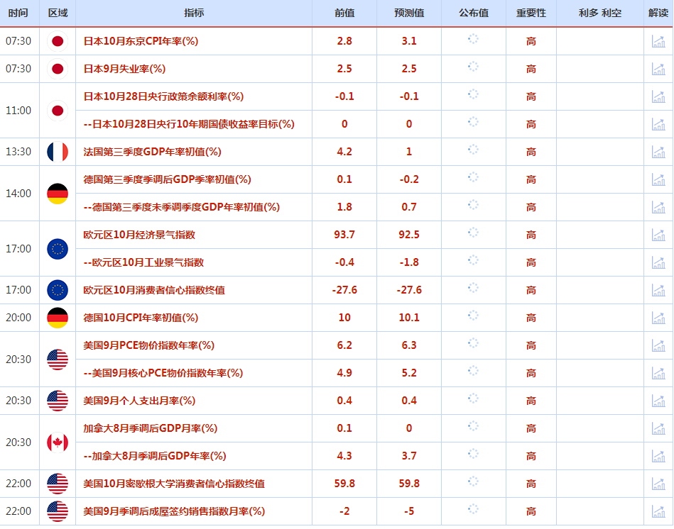 美元指数交投于110.56附近;美元周四走强,美国第三季国内生产总值(GDP)结束了连续两个季度产出下降的趋势,这曾引发人们对经济陷入衰退的担忧;欧元下跌超过1%,兑美元回到平价之下,欧洲央行将存款利率提高75个基点,至1.5%的2009年以来最高水平,以防止价格快速增长变得根深蒂固;金价下跌,美元上涨盖过了美联储在下周政策会议后将放缓加息的预期带来的支持;油价延续了前一天近3%的涨势,因为对美国原油出口创纪录的乐观情绪和经济衰退担忧减弱的迹象盖过了对需求疲软的担忧。