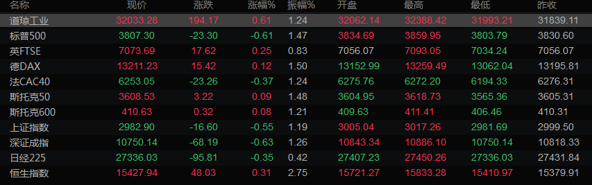 道琼斯工业指数上涨0.61%,至32033.28点;