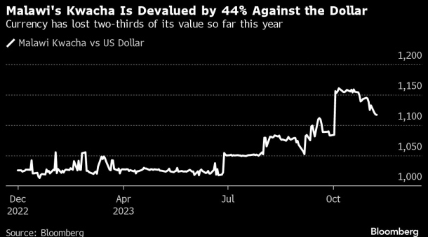 马拉维储备银行在一份声明中表示,周四(11月9日)的货币牌价中,美元/克瓦查报价为1,700,此前为1,180.29。根据彭博社汇编的数据,此次调整使克瓦查的价值比年初下降了三分之二。