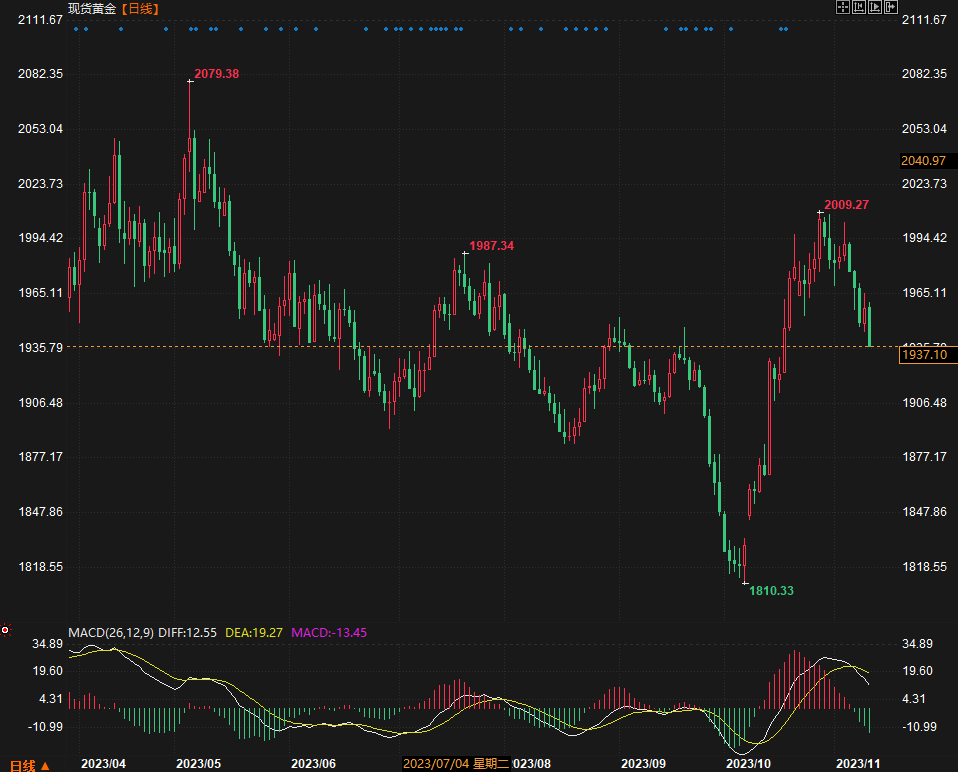 现货黄金下跌1.04%,至1,938.18美元/盎司。