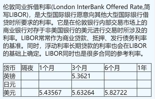 伦敦同业拆借利率(London InterBank Offered Rate,简写LIBOR),是大型国际银行愿意向其他大型国际银行借贷时所要求的利率。它是在伦敦银行内部交易市场上的商业银行对存于非美国银行的美元进行交易时所涉及的利率。LIBOR常常作为商业贷款、抵押、发行债务利率的基准。同时,浮动利率长期贷款的利率也会在LIBOR的基础上确定。LIBOR同时也是很多合同的参考利率。