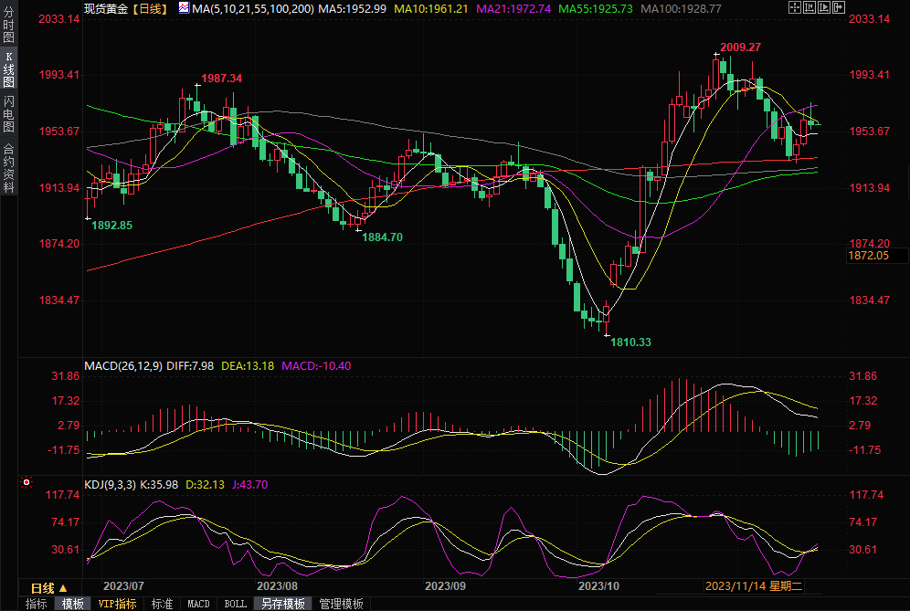现货黄金周三收跌0.19%,收报1959.25美元/盎司。