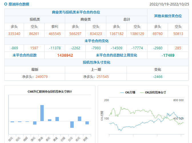 能源类持仓:截至10月25日当周,投机者所持布伦特和WTI原油净多头头寸增加33849手至390575手合约。其中NYMEX WTI原油净多头头寸增加5879手至181929手合约。NYMEX汽油净多头头寸增至55687手合约,创最近八周新高。NYMEX柴油净多头头寸增至23954手合约。NYMEX天然气净多头头寸降至19204手合约,创最近逾两年新低。