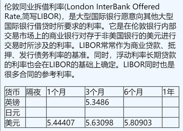 伦敦同业拆借利率(London InterBank Offered Rate,简写LIBOR),是大型国际银行愿意向其他大型国际银行借贷时所要求的利率。它是在伦敦银行内部交易市场上的商业银行对存于非美国银行的美元进行交易时所涉及的利率。LIBOR常常作为商业贷款、抵押、发行债务利率的基准。同时,浮动利率长期贷款的利率也会在LIBOR的基础上确定。LIBOR同时也是很多合同的参考利率。