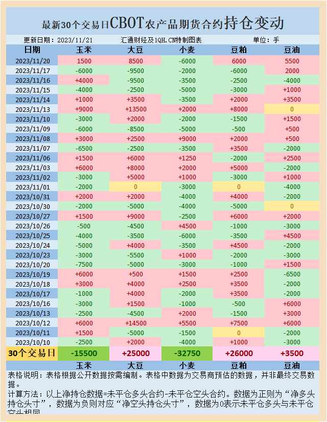 大宗商品基金本周一(11月20日)增加小麦投机性净多头头寸,增加玉米、大豆、豆油、豆粕投机性净空头头寸。最近30个交易日,大宗商品基金本增加玉米、小麦投机性净空头头寸,增加豆粕、大豆、豆油投机性净多头头寸。