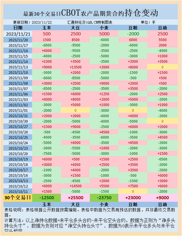 交易商估算的结果显示,大宗商品基金本周二(11月21日)增加玉米、大豆、豆油、小麦投机性净多头头寸,增加豆粕投机性净空头头寸。最近30个交易日,大宗商品基金本增加玉米、小麦投机性净空头头寸,增加豆粕、大豆、豆油投机性净多头头寸。