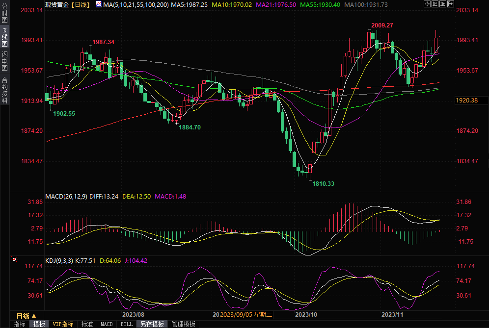 现货黄金周二收报1998.29美元/盎司,涨幅1.04%。