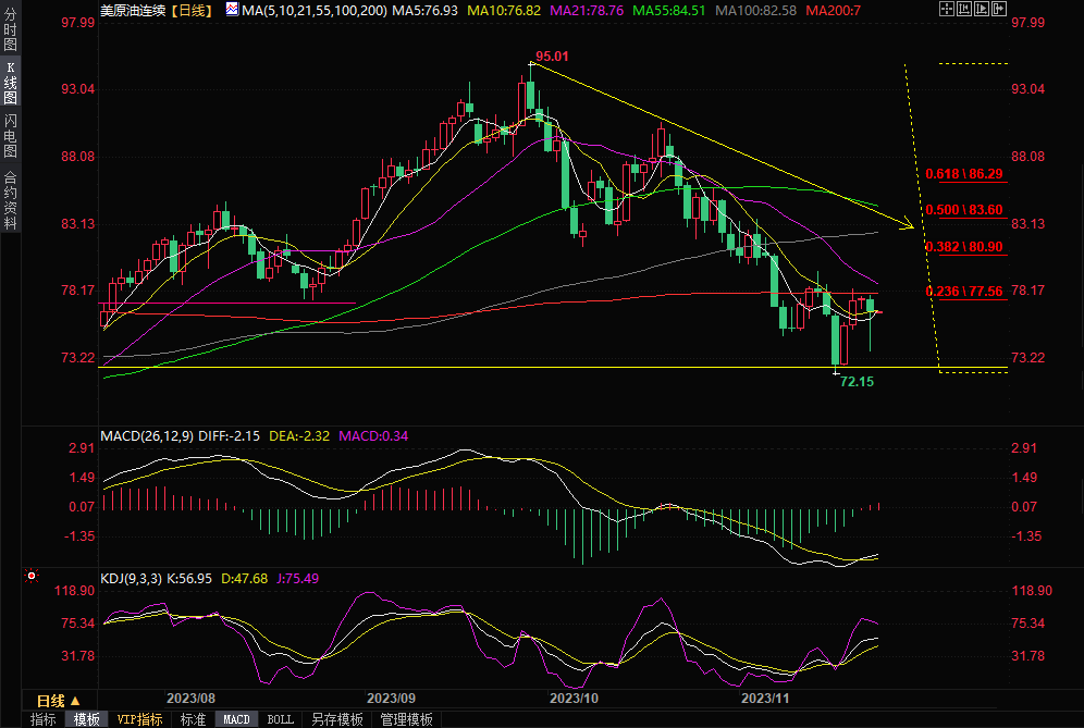 WTI 1月原油期货收跌0.67美元/桶,跌幅0.86%,收报77.10美元/桶,在盘中曾一度跌超5.1%,至盘中最低点73.79美元/桶。#原油收盘#