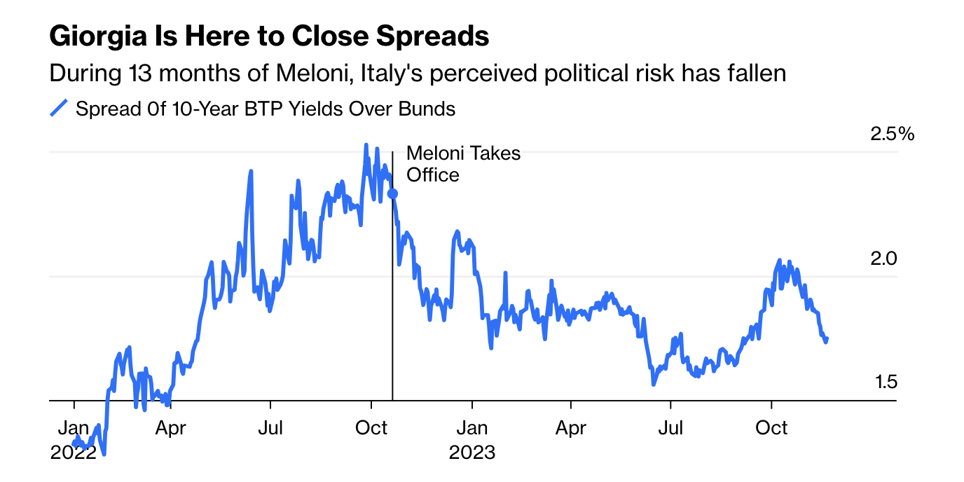 梅洛尼的首相任期还远没有结束,但到目前为止,市场似乎非常庆幸他们最担心的事情还没有成为现实。自她上任以来,10 年期意大利 BTP 收益率相对于等值德国国债的利差(衡量国家风险的关键指标)已大幅下降。