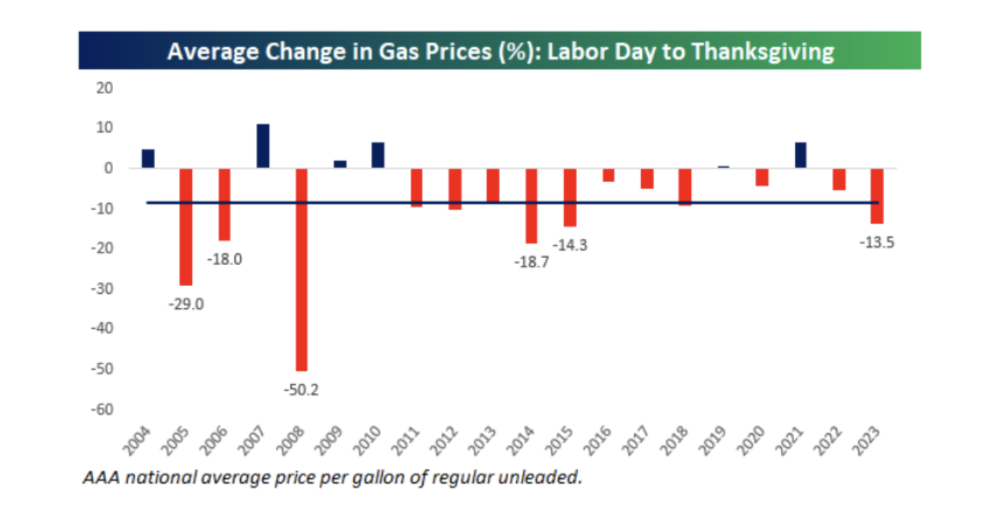 每年这个时候汽油价格发生变化并不罕见,但 2023 年从劳动节到感恩节期间的跌幅明显高于平均水平,正如 Bespoke Investment Group 在此图表中所示。