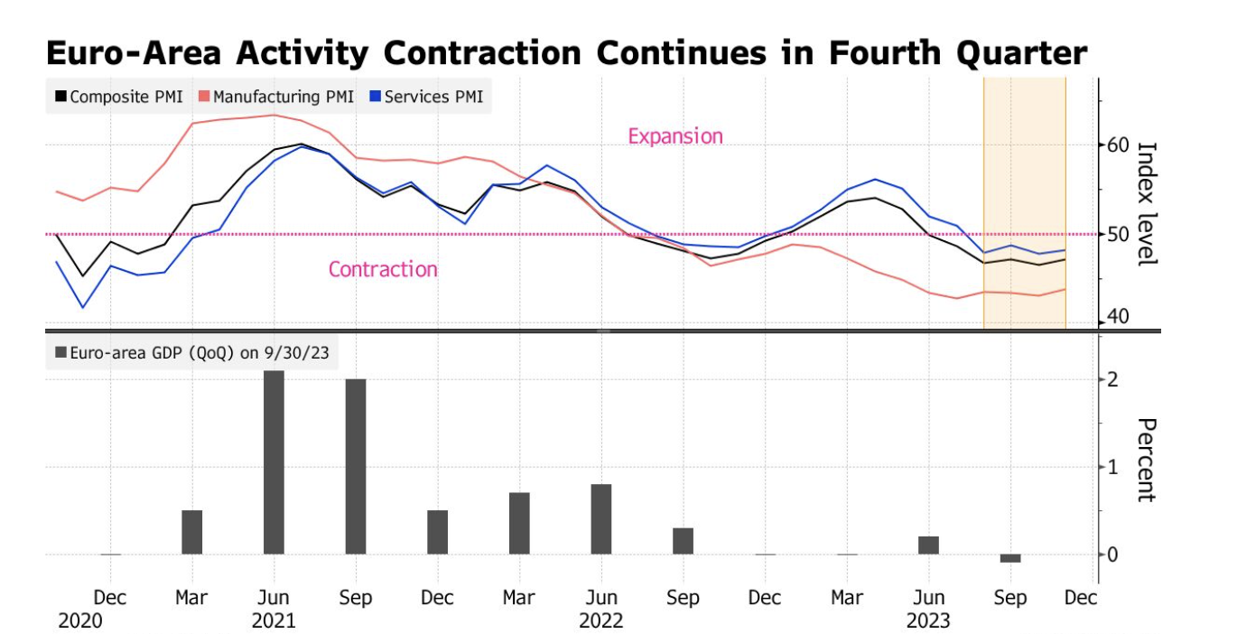 欧元区陷入衰退的可能性越来越大,周四(11月24日)HCOB 最新采购经理人(PMI)指数最新数据显示,11 月份欧元区制造业与服务业一起放缓了收缩步伐。