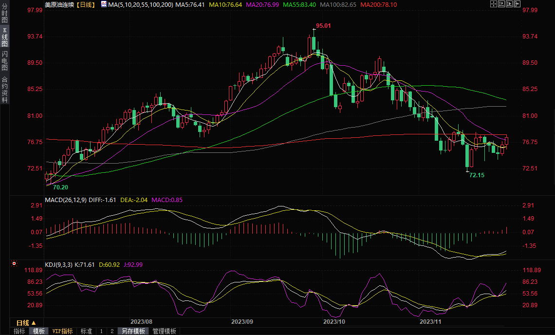WTI 1月原油期货周三收涨1.45美元/桶,涨幅将近1.90%,收报77.86美元/桶,盘中曾刷新一周高点至78.07美元/桶,也正好是200日均线阻力所在。