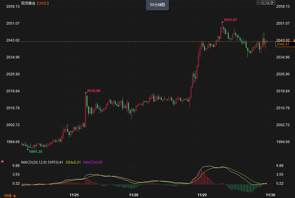 现货黄金30分钟走势图)