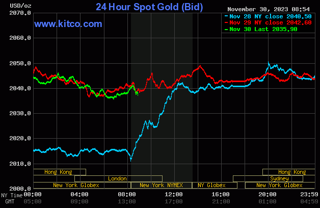 PCE数据发布后,现货黄金短线走低5美元,现报2037.97美元/盎司。