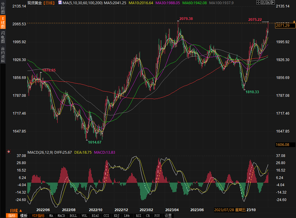 现货黄金最新交易价格为2,071.93美元/盎司,日内上涨1.76%。
