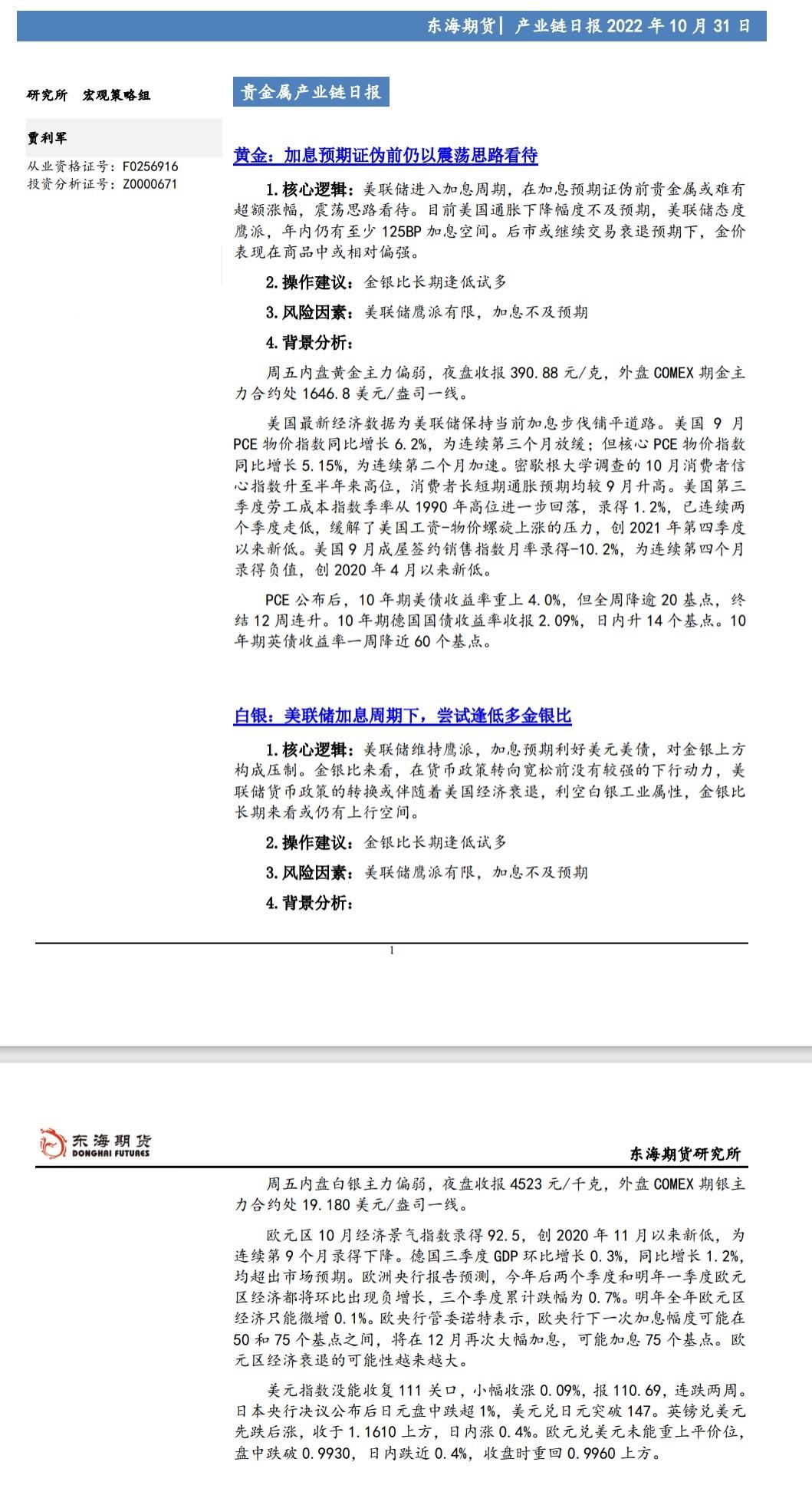 标题:【东海期货10月31日产业链日报】贵金属篇:美元及美债收益率小涨,金银偏弱