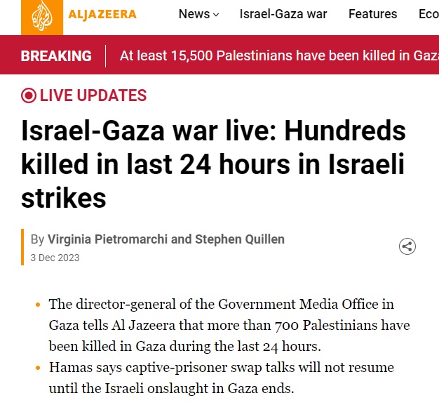 加沙政府媒体办公室主任告诉半岛电视台,在过去24小时内,有700多名巴勒斯坦人在加沙被杀。