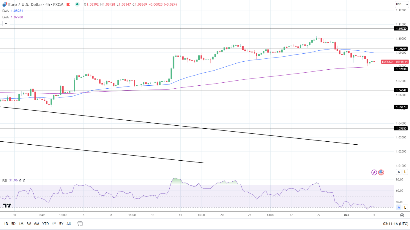 4 小时图上的 RSI读数 为 31.96,表明欧元/美元在进入超卖区域之前先跌至 1.08000 美元关口。