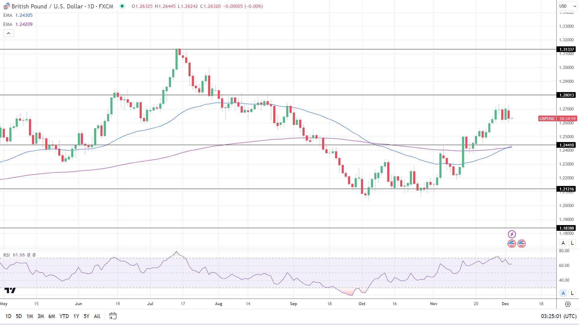 14 期 RSI 读数为 61.66,表明英镑/美元在进入超买区域之前将回到 1.27 美元。