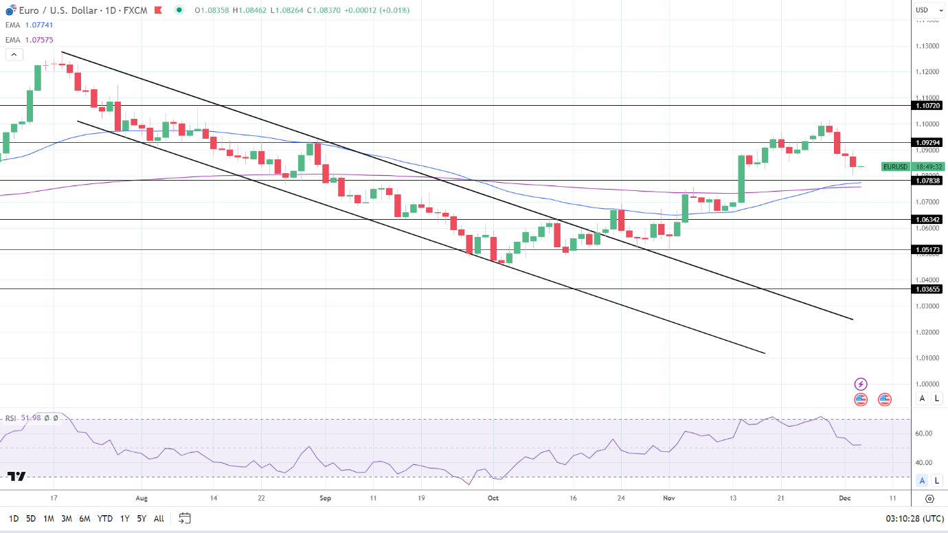 欧元/美元突破 1.09294 美元阻力位将支撑其升至 1.10 美元关口和 1.10720 美元阻力位。然而,欧元/美元跌破 1.07838 美元支撑位和 50 日均线将使 200 日均线发挥作用。