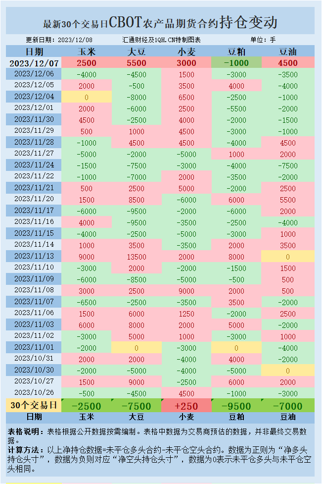 交易商估算的结果显示,大宗商品基金本周四(12月07日)增加豆粕投机性净空头头寸,增加大豆、豆油、玉米、小麦投机性净多头头寸。最新30个交易日,大宗商品基金增加豆油、玉米、豆粕、大豆投机性净空头头寸,增加小麦投机性净多头头寸。
