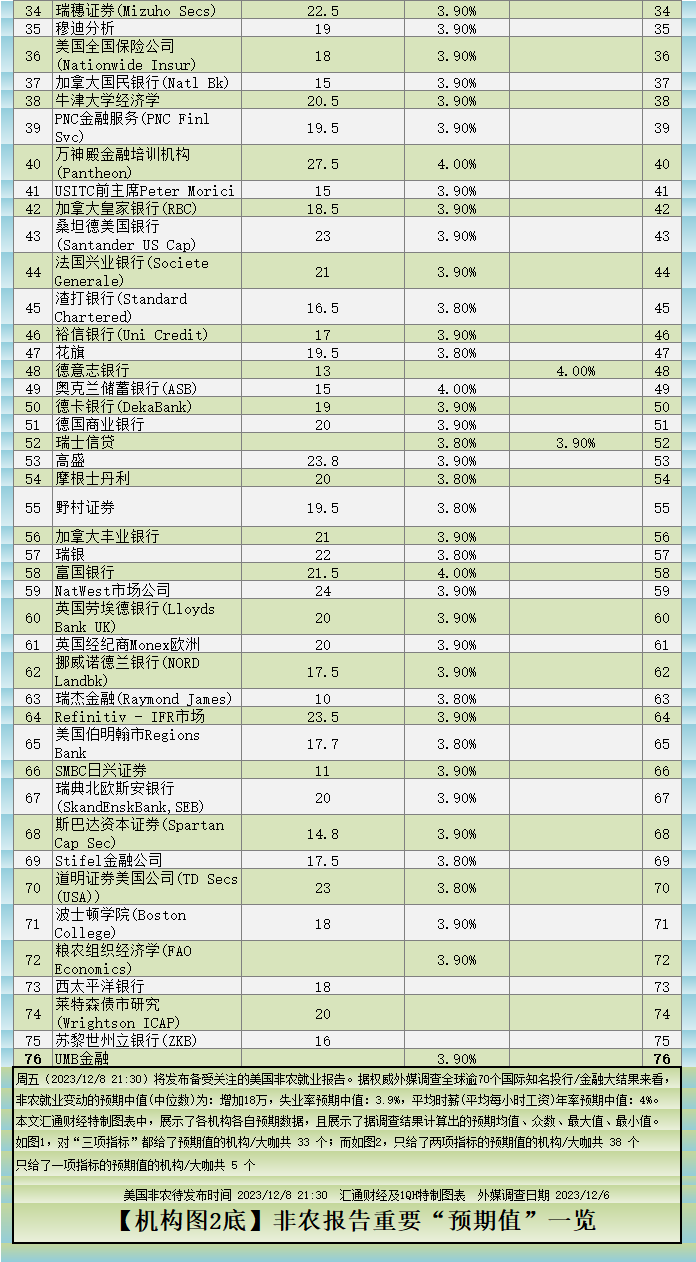 汇通财经APP讯——周五(2023/12/8 21:30)将发布备受关注的美国非农就业报告。据权威外媒调查全球逾70个国际知名投行/金融大结果来看,11月非农就业变动的预期中值(中位数)为:增加18万,失业率预期中值:3.9%,平均时薪(平均每小时工资)年率预期中值:4%。