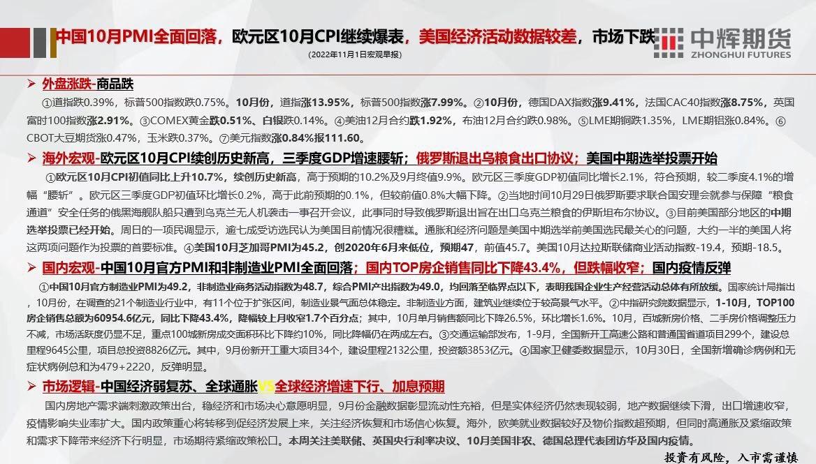 标题:中辉期货宏观早报:欧元区10月CPI继续爆表,美国经济活动数据较差,关注美联储决议和10月非农
